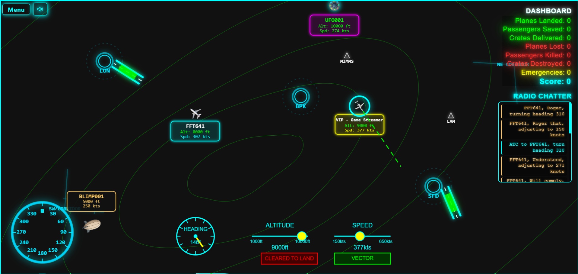 ATC Emergency! is a neon-soaked airspace thriller where calm skies turn to chaos as your score climbs. Start with a gentle trickle of traffic, then feel the tension spike past 5,000 as thunderous storms brew, F‑35s slice through your air corridors, and planes call in low fuel, radar failures, inverted controls, medical dramas, and the occasional drunk pilot. Keep vectors clean, juggle altitudes, and thread the needle—or watch the sky burn.